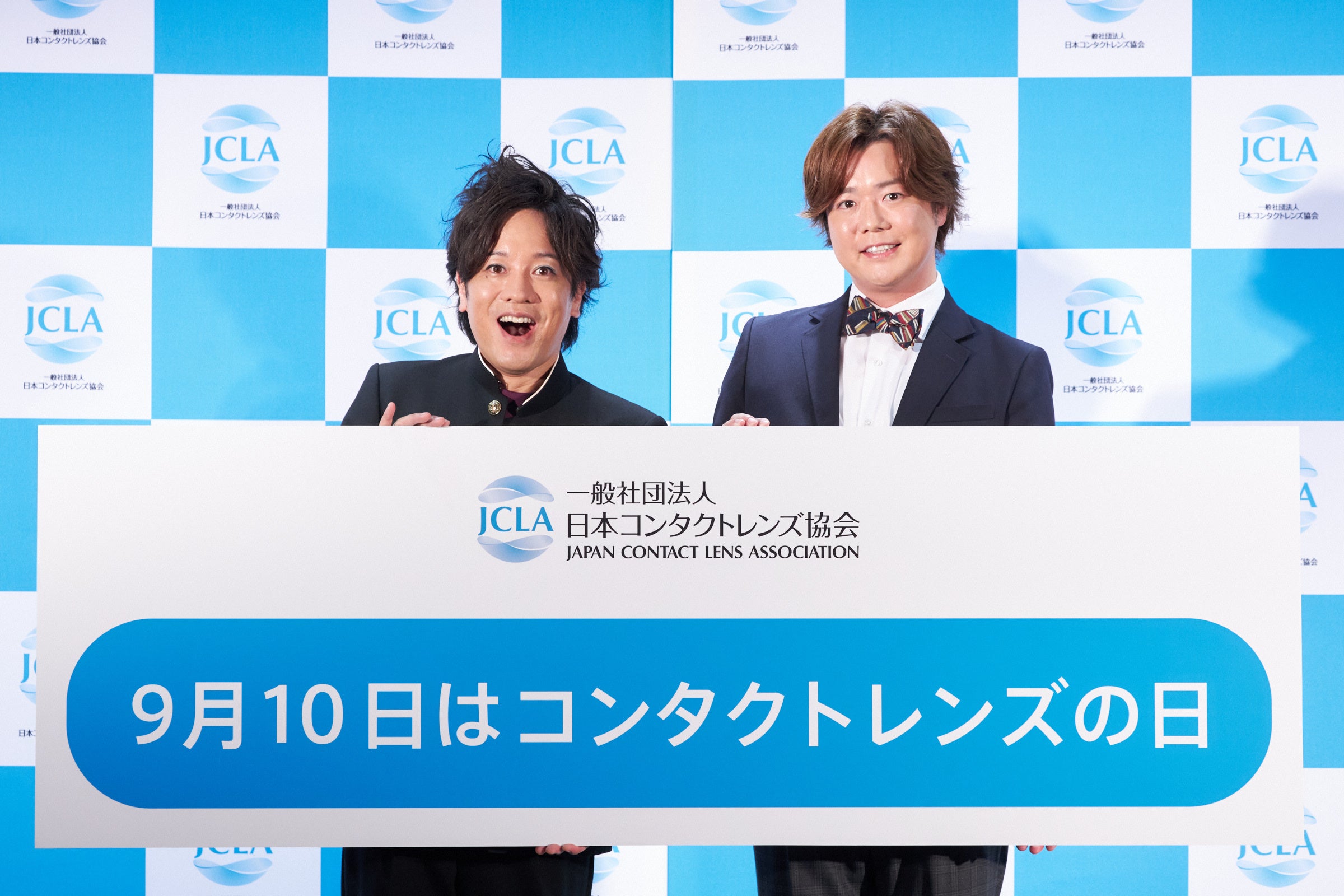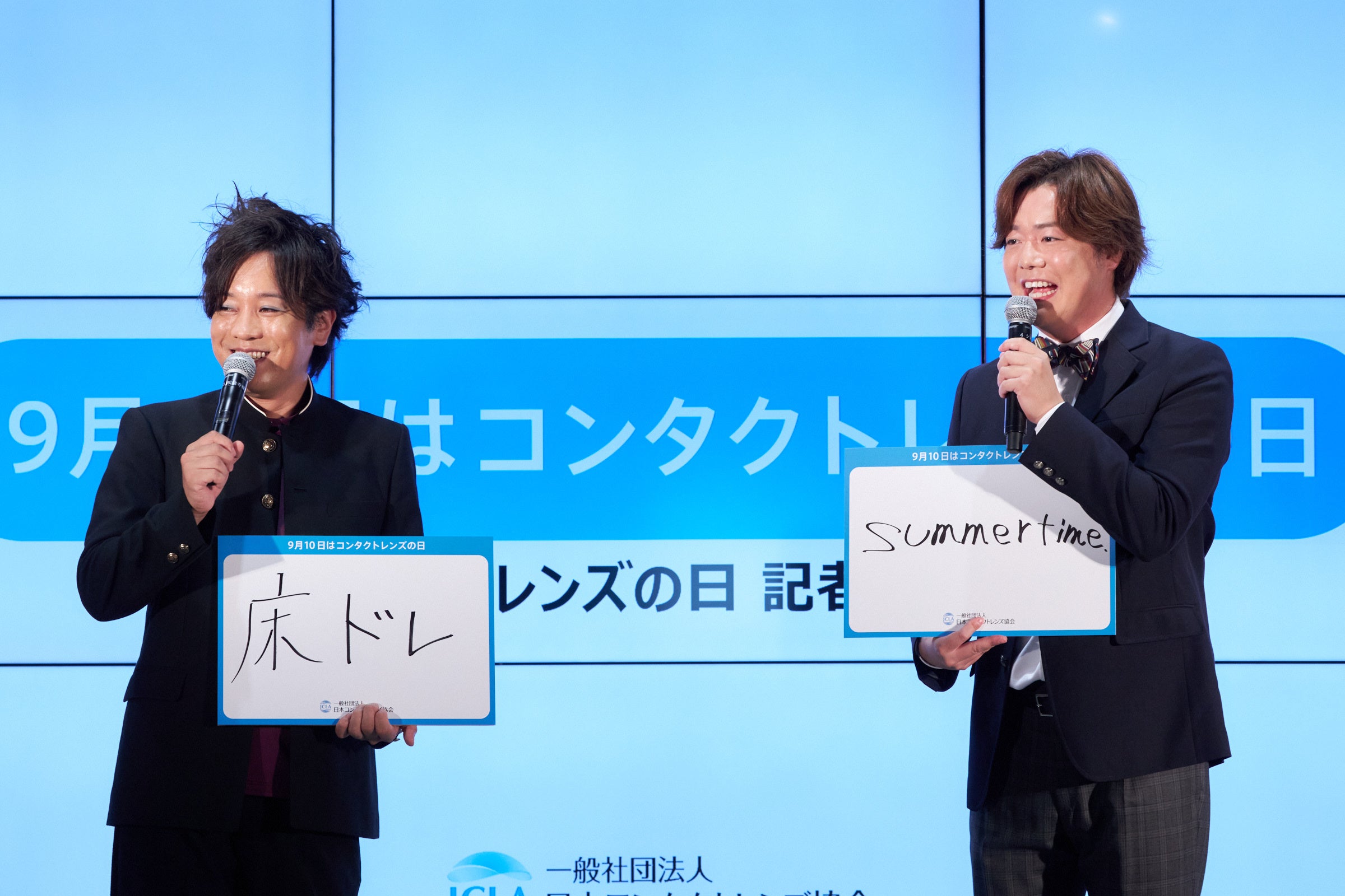 続いて、今年でコンビ結成15周年となるぺこぱさんがゲストとして登壇しました。特に若い世代の方々に「正しいコンタクトレンズの使用方法」を啓発するということで、松陰寺さんは学ラン、シュウペイさんはブレザーの学生服姿で登場し、松陰寺さんは「クラスのイケてるグループの見張り役でした。」、シュウペイさんは「部活でサッカー漬けだったので、周りの友達が彼女と下校したりしているのに憧れていましたね。」と学生時代を振り返りました。またコンタクトレンズデビューについて伺うと、専門学生時代にコンタクトレンズを使用し始めた松陰寺さんは「モテたくて!」、高校生の時にデビューしたシュウペイさんは「部活がきっかけですね。初めてコンタクトレンズを使用した時は、すごくクリアに見えて世界が変わりました!今では無人島に一番持っていきたいものはコンタクトレンズと答えるくらい必要です。」と熱く語っていただきました。