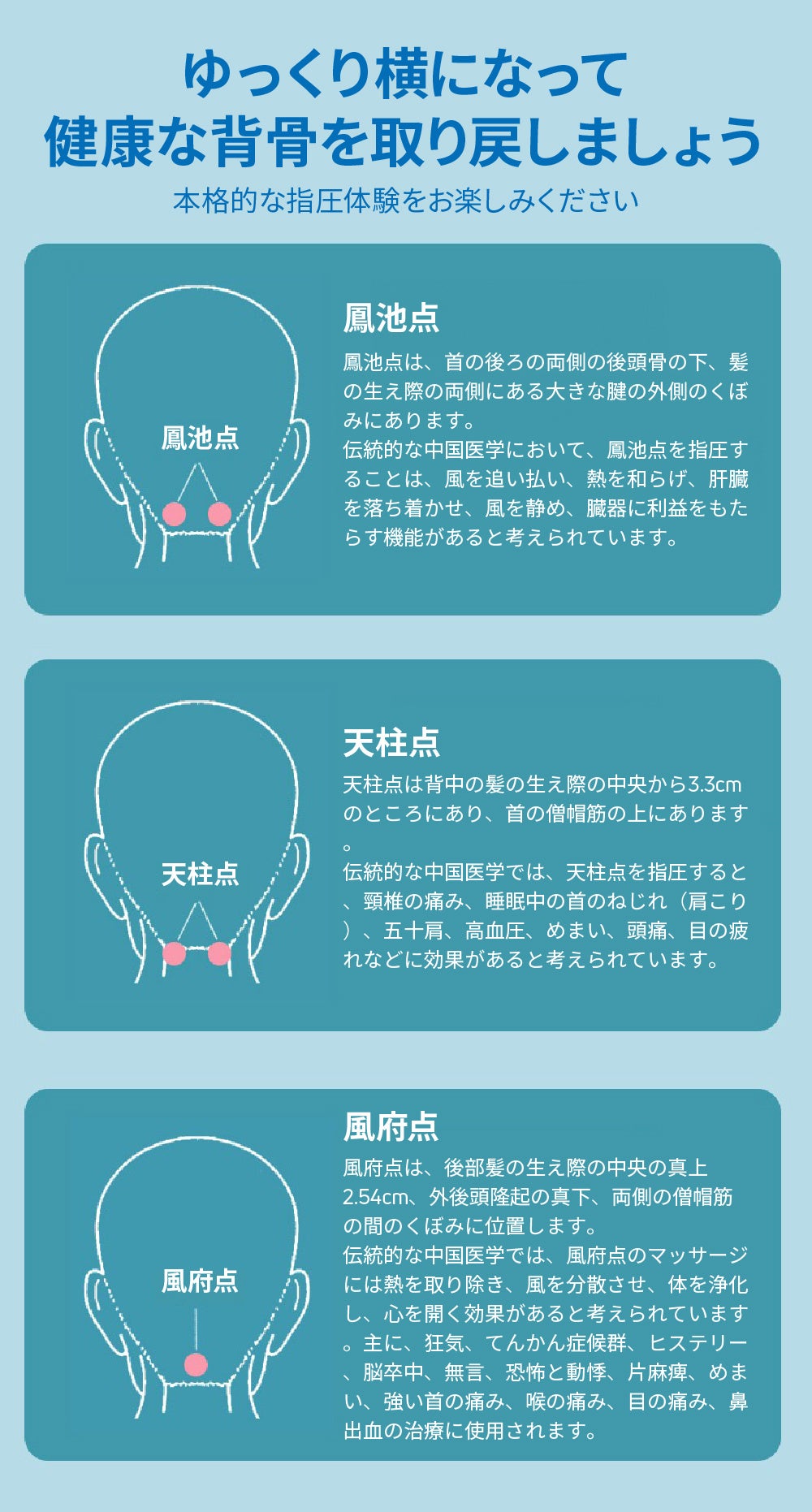 CozyNapeは人体のツボに関する中国医学の研究に基づいて設計され、あなたの首に快適なサポートを提供します。