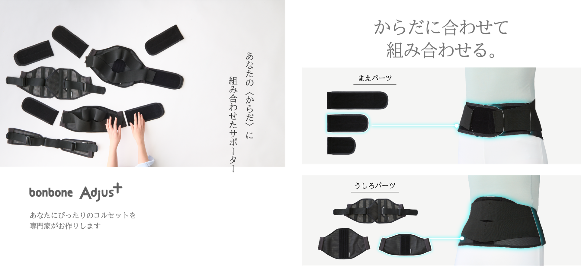 ライフスタイルなどに合わせてパーツを組み替え、使う人に寄り添うコルセット「bonbone Adujust(ボンボーンアジャスト) 腰」を2021年9月7日より、足首の状態に合わせてサポートが変えられる「bonbone Adjust(ボンボーン アジャスト) 足首」を2022年10月28日より、どちらも柔整・鍼灸業界向けとして発売しました。