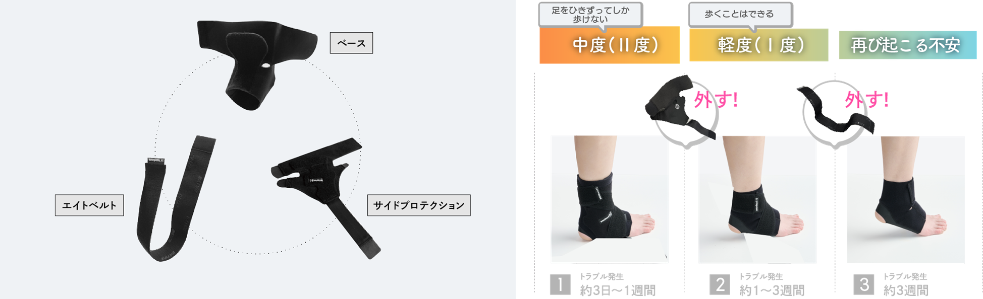3つのパーツの付け替えにより、包帯やテーピングを巻き付けるように、足首の状態に合わせてサポートを変えることができます。足首の急なトラブルから自立まで段階的なサポートが可能です。