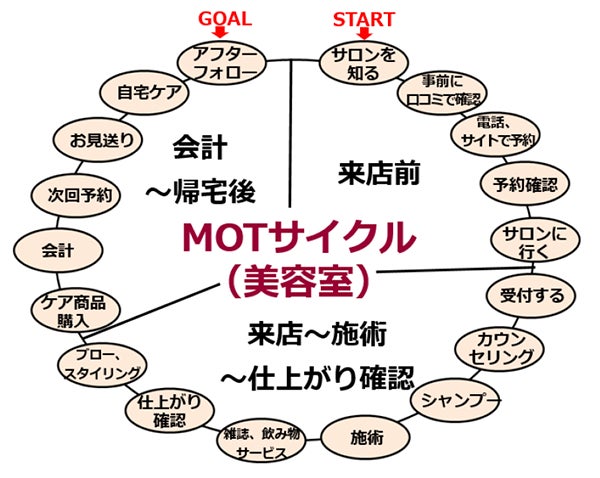 『ホットペッパービューティーアカデミー』では、「NPO法人 顧客ロイヤルティ協会」の協力の下、「美容室のMOTサイクル」を作成し、お客さまの美容室利用における18の接点から、どのポイントで「お店の継続利用・変更を決めているのか」を調べています。