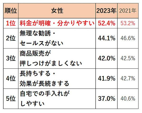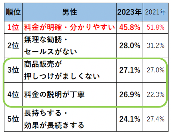 男女共1位は「料金が明確・分かりやすい」。男性は「商品販売が押しつけがましくない」、「料金の説明が丁寧」のスコアが前回調査時を上回る。