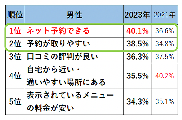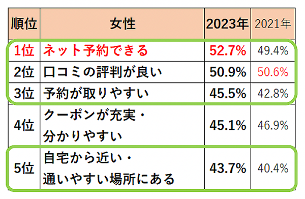 男女共1位は「ネット予約できる」。前回調査時からは男女共、「ネット予約できる」と「予約が取りやすい」のスコアが上昇。女性では、「口コミの評判が良い」「自宅から近い・通いやすい場所にある」のスコアも上昇。