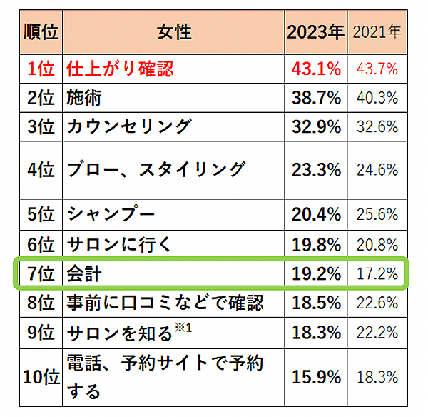 「コンビニの数よりも多い」美容室は、競争環境が激しくリピート客を増やすことが経営安定のカギになります。施術の良しあしは、リピートを決める重要な要素です。しかし、それ以外にもスタッフと接するさまざまな場面において、顧客が「満足」や「不満」を感じるポイントはたくさん存在し、施術が良いからといって必ずしもリピートに結びつくわけではありません。男女共前回調査時(2021年)からスコアが上昇している「会計」は、この2年の間にキャッシュレス、オンライン決済など決済手段が多様化したことも影響しているでしょう。「ストレスフリーな会計」が他店との差別化にもつながっていると考えます。