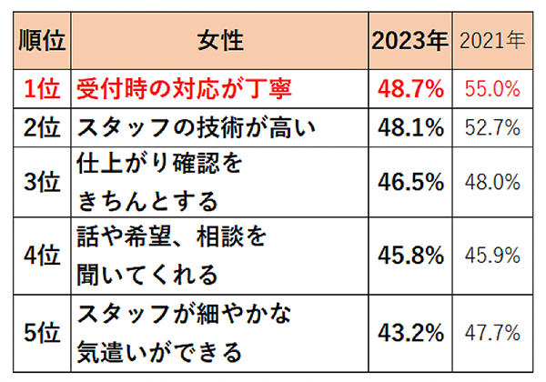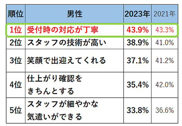 男女共1位は「受付時の対応が丁寧」で、「スタッフの技術が高い」を上回る。男性は「受付時の対応が丁寧」のスコアが前回調査時を上回る。