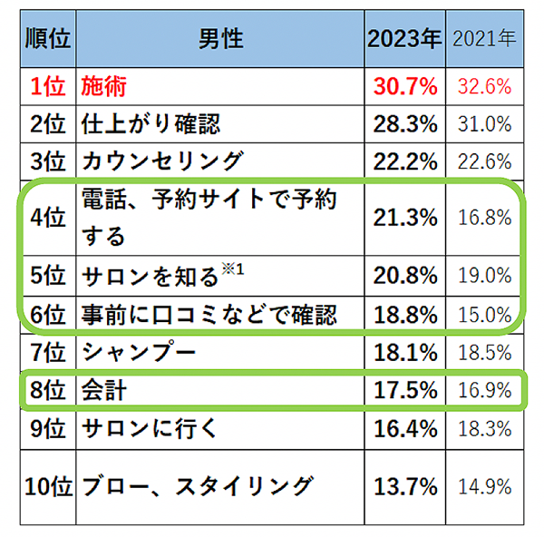 トップ3には、男女共「仕上がり確認」「施術」「カウンセリング」がランクイン。前回調査時(2021年)からは、男女共「会計」のスコアが上昇。さらに男性は、来店前の場面(「予約」、「サロンを知る※1」、「口コミ」)のスコアが上昇している。
