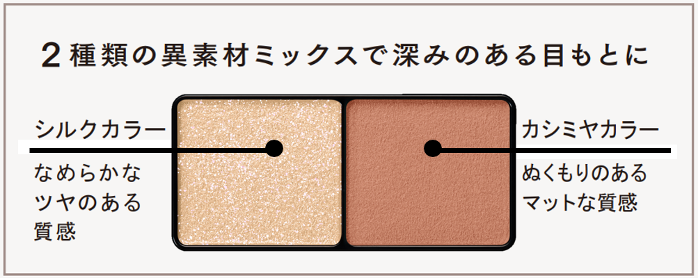 ーなめらかなツヤを放つ 「シルクカラー 」と、ぬくもりのあるマットな 「カシミヤカラー 」 の2種をセット。 ー肌なじみのよいゴールドパール配合
