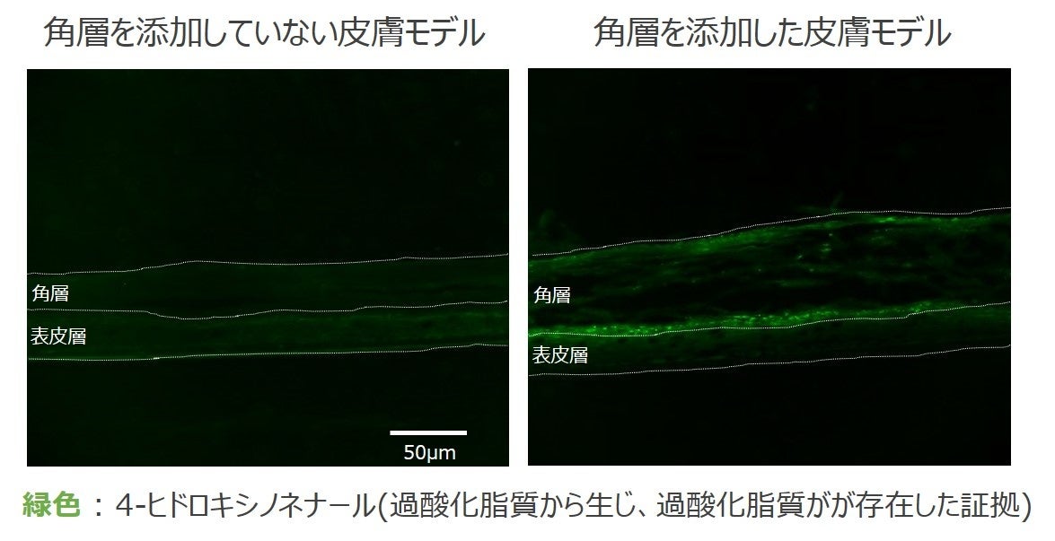 実際に角層を添加してから3 日目の状態を見てみると、角層を添加した皮膚モデルは、添加していない皮膚モデルよりも細胞の生存率が約 20%低下していました。さらに、角層を添加していない皮膚モデルの断面図では、皮膚モデルの角層がきれいに積み重なって層状に育っていた半面、角層を添加した皮膚モデルの断面図では、角層が厚くなり内側の層で多くの隙間ができていました。併せて、角層を添加した皮膚モデルでは水分の蒸散率が約20%高くなっていました。