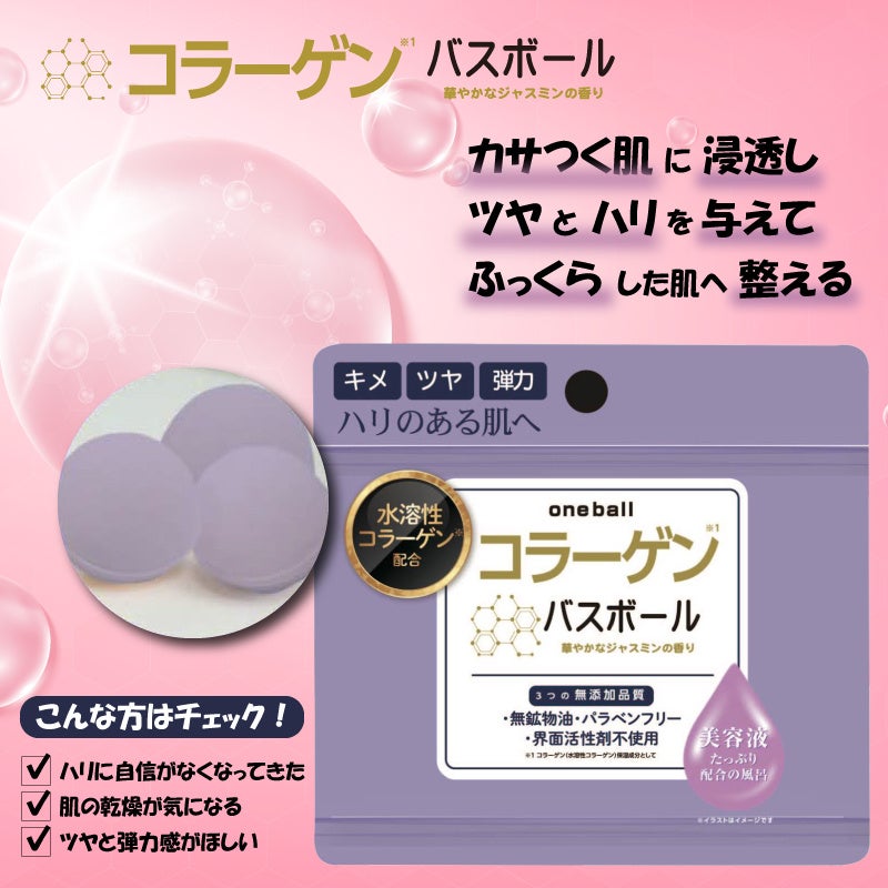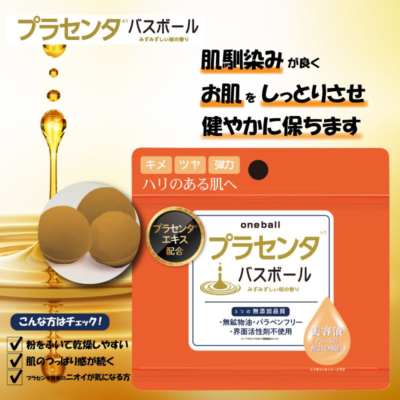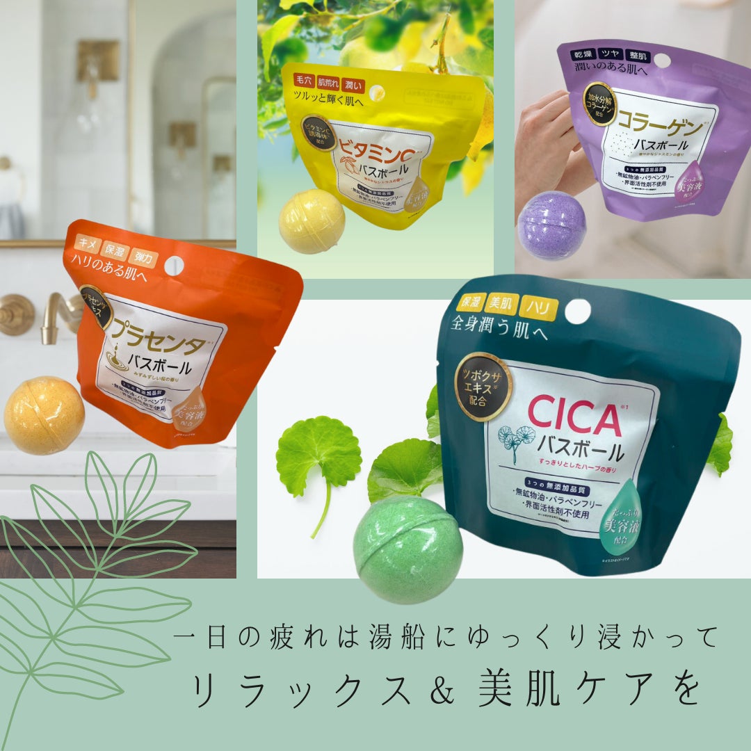 今まで、ありそうで無かったバスボールでのプラセンタ・ビタミンC・コラーゲン・CICAを配合