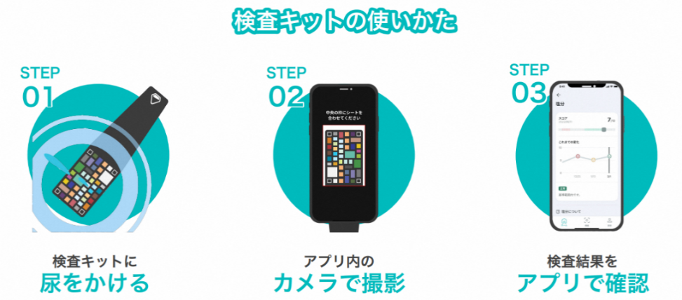 ユーグレナ社が栄養検査ベンチャーのユーリア社と共同研究、および開発している簡易迅速尿検査サービスです。尿をかけた検査キットをスマートフォンの専用アプリで撮影すると、約2分で栄養バランスをチェックできます。測定できる項目は、ビタミンやミネラルなど直近の食生活に関連するものから、酸化ストレスなど日々の生活環境が関連するものまで幅広く対応しています。