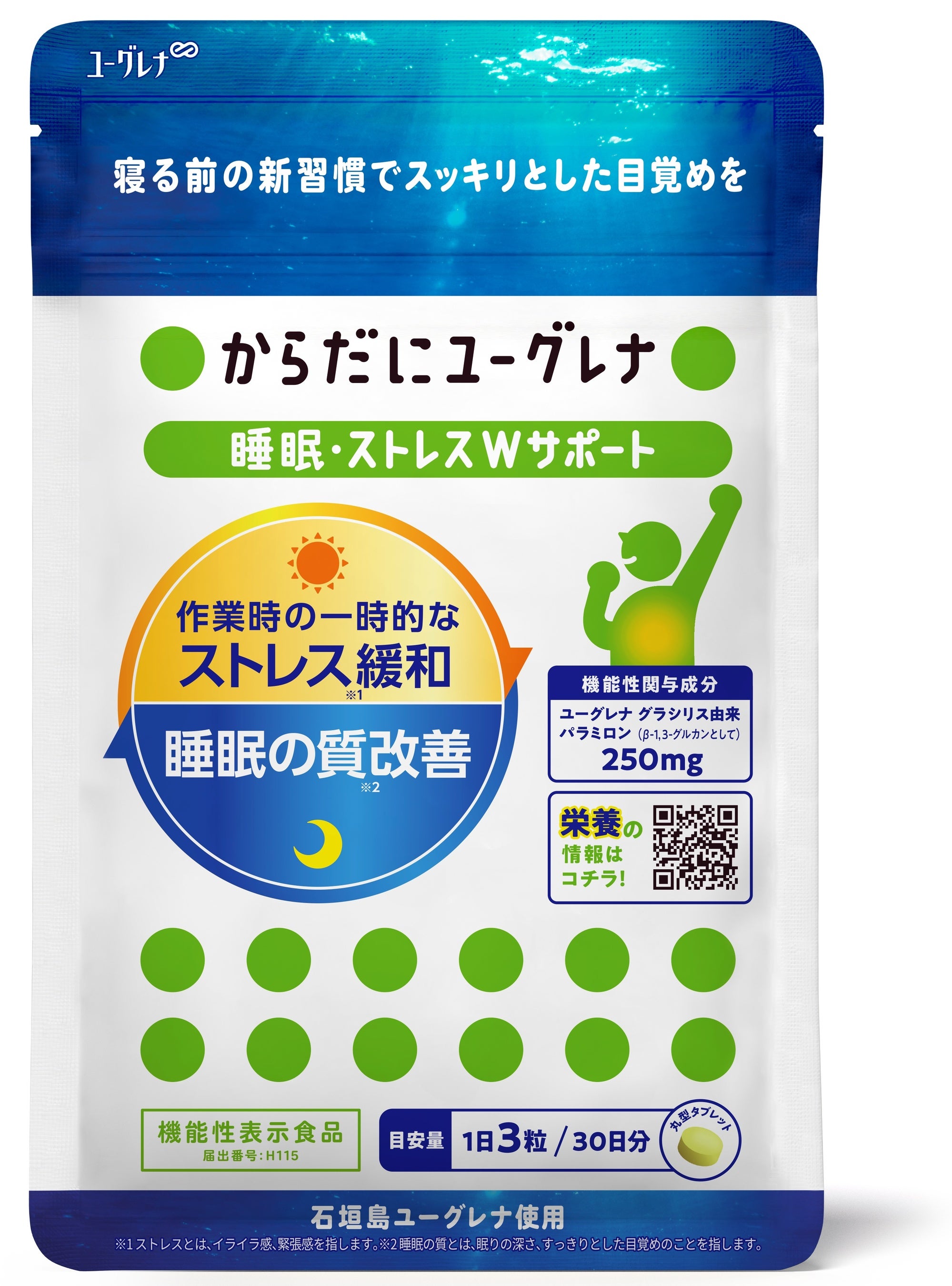 睡眠の質・ストレスにWで働く機能性表示食品です。自然豊かな石垣島で育った微細藻類ユーグレナの59種類の栄養素を一度に摂ることができます。本品に含まれるユーグレナグラシリス由来のパラミロンには、作業時の一時的なストレスを緩和する機能、睡眠の質(眠りの深さ、すっきりとした目覚め)を改善する機能が報告されています。