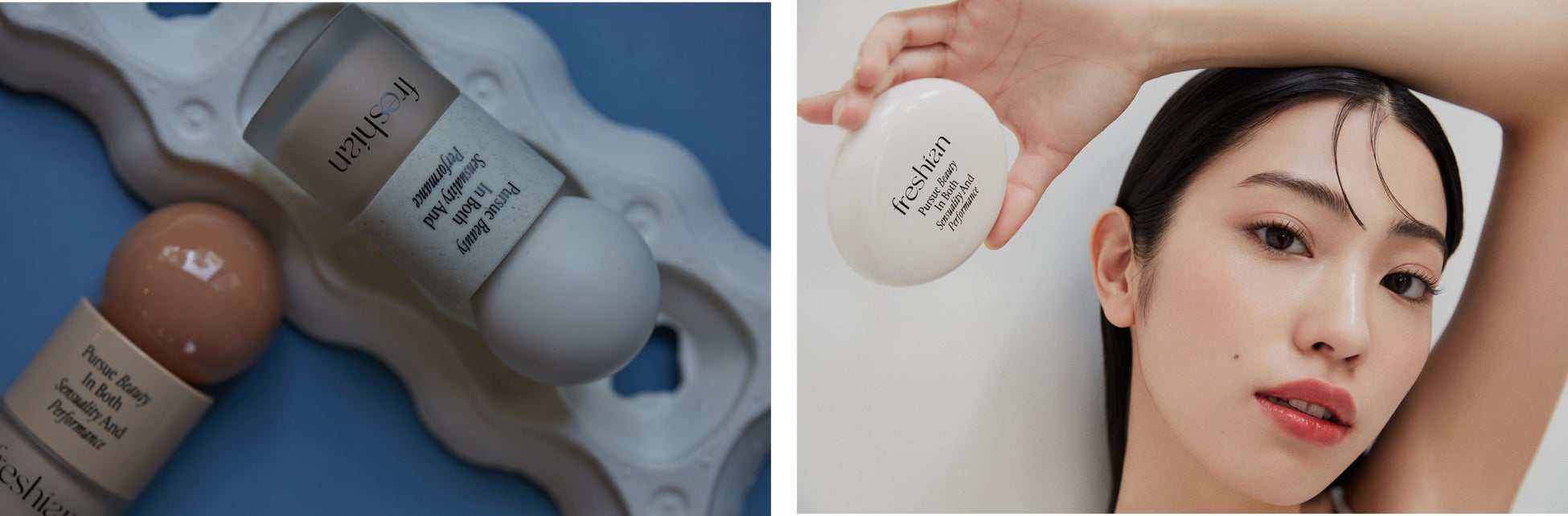 「freshian」は、全製品にイチジク、5種のヒアルロン酸、マデカソサイドが含まれています。メイクとスキンケアの長所と効能を組み合わせ、メイクをしながらも肌の刺激を鎮静化し、肌の油分と水分のバランスをケアできるアイテムです。