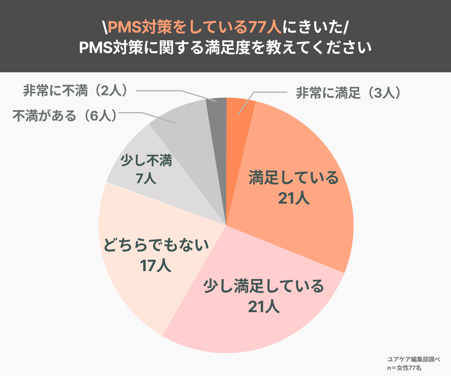 また、PMS対策をしている・したことがある77名を対象に、対策の満足度を質問したところ、以下のような結果となりました。