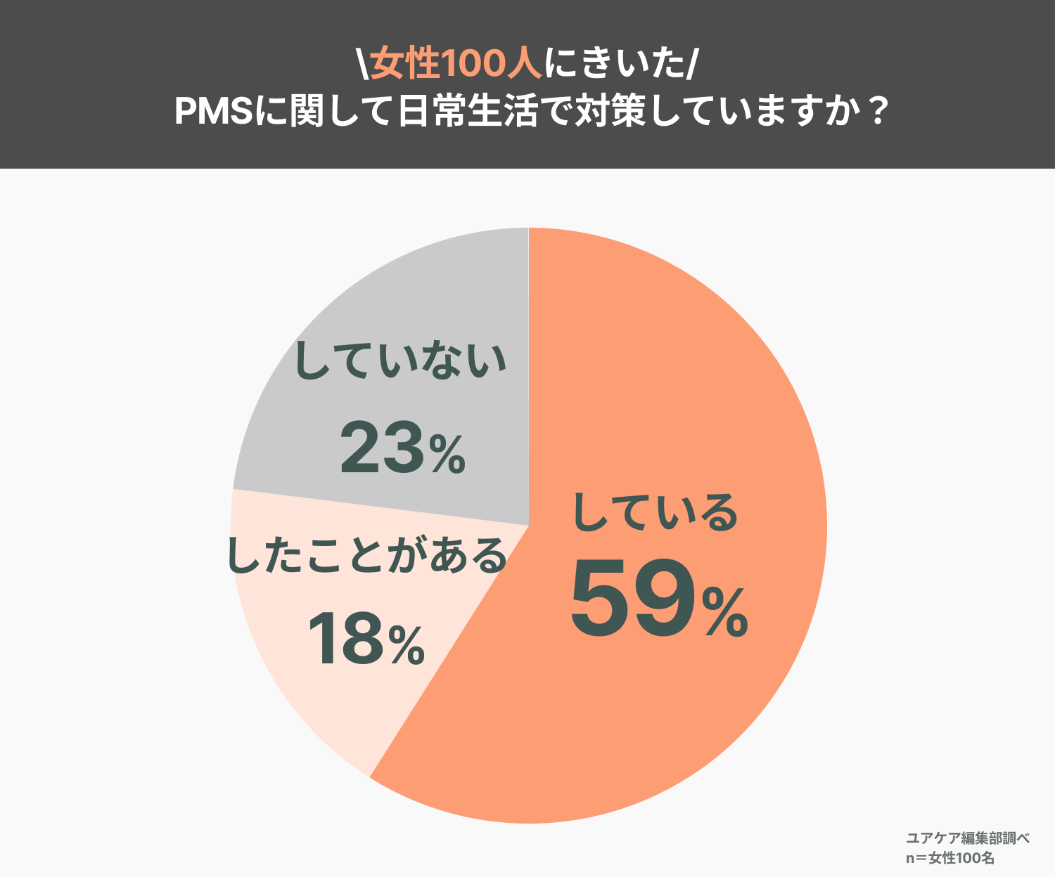 アンケート回答者に「PMSに関して日常生活で対策していますか?」と聞いたところ「している」と回答した人が59%、「したことがある」と回答した人が18%と、全体の77%の方がPMS対策の経験があるという結果に。