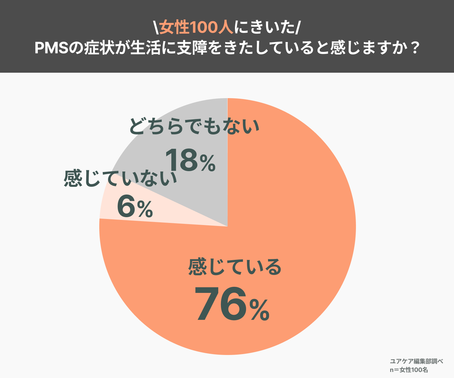 PMSが日常生活に支障をきたしていると感じるかのアンケートを実施したところ、76%の女性が支障をきたしていると感じる回答。4人のうち3人は生理時のPMSによる腹痛や気分の落ち込みで悩まされていることが分かりました。