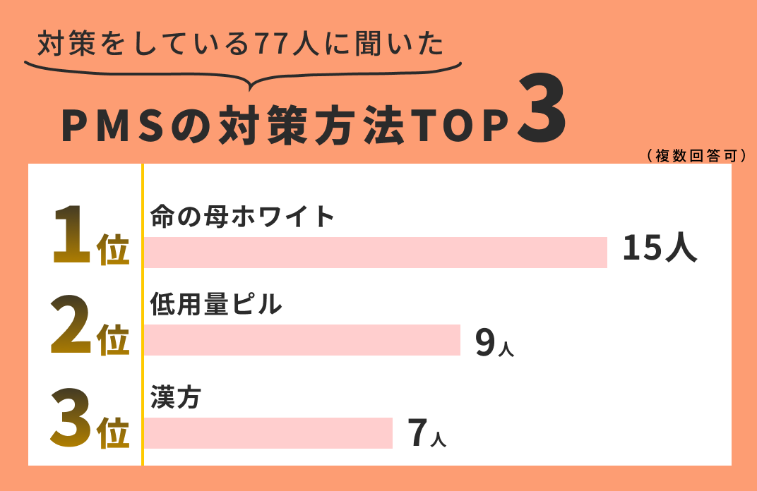 PMS対策をしたことがある77名の方に「なにでPMS対策をしましたか?」と聞いたところ、1番多いPMS対策は「命の母ホワイト」ということがわかりました。次に「低用量ピル」「漢方」「サプリ」続きました。