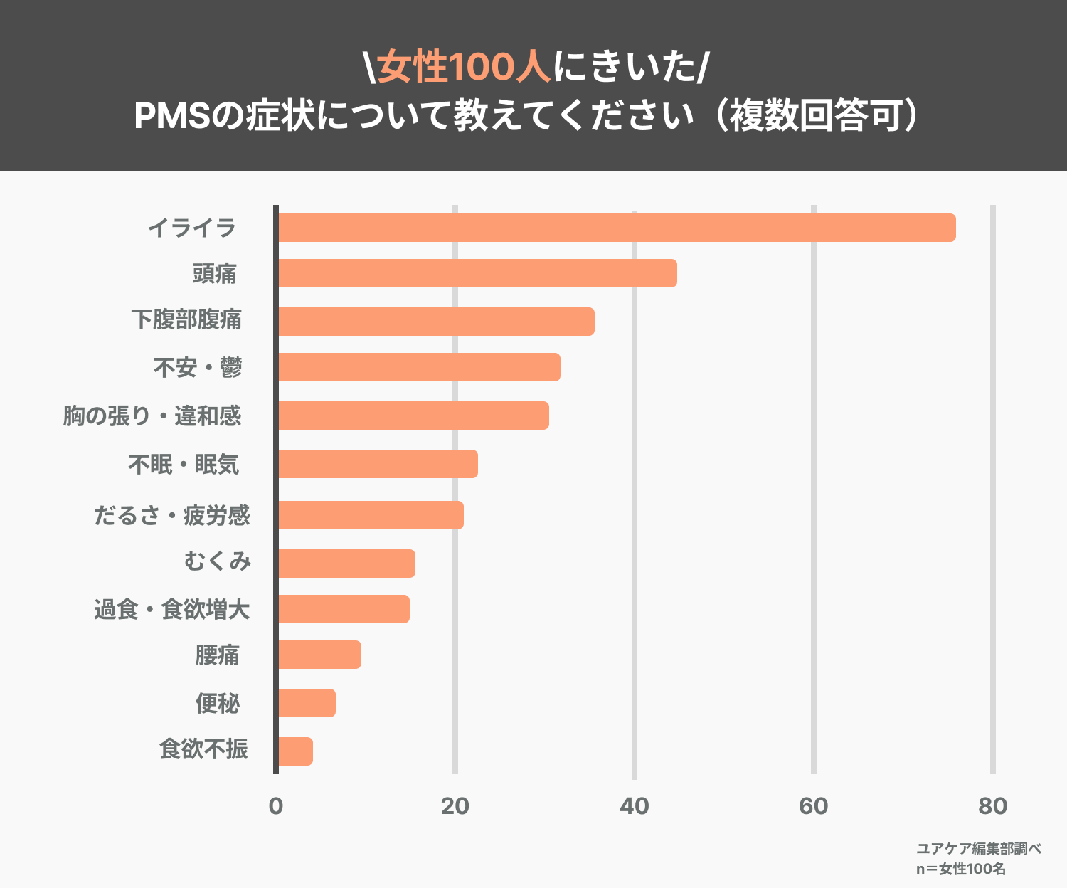 2番目に多い症状である「頭痛」を感じる人は50人以下と、100人中50人以上が感じる症状が「いらだち」のみという結果に。PMSで感じる症状には大きな個人差があるということがわかりました。