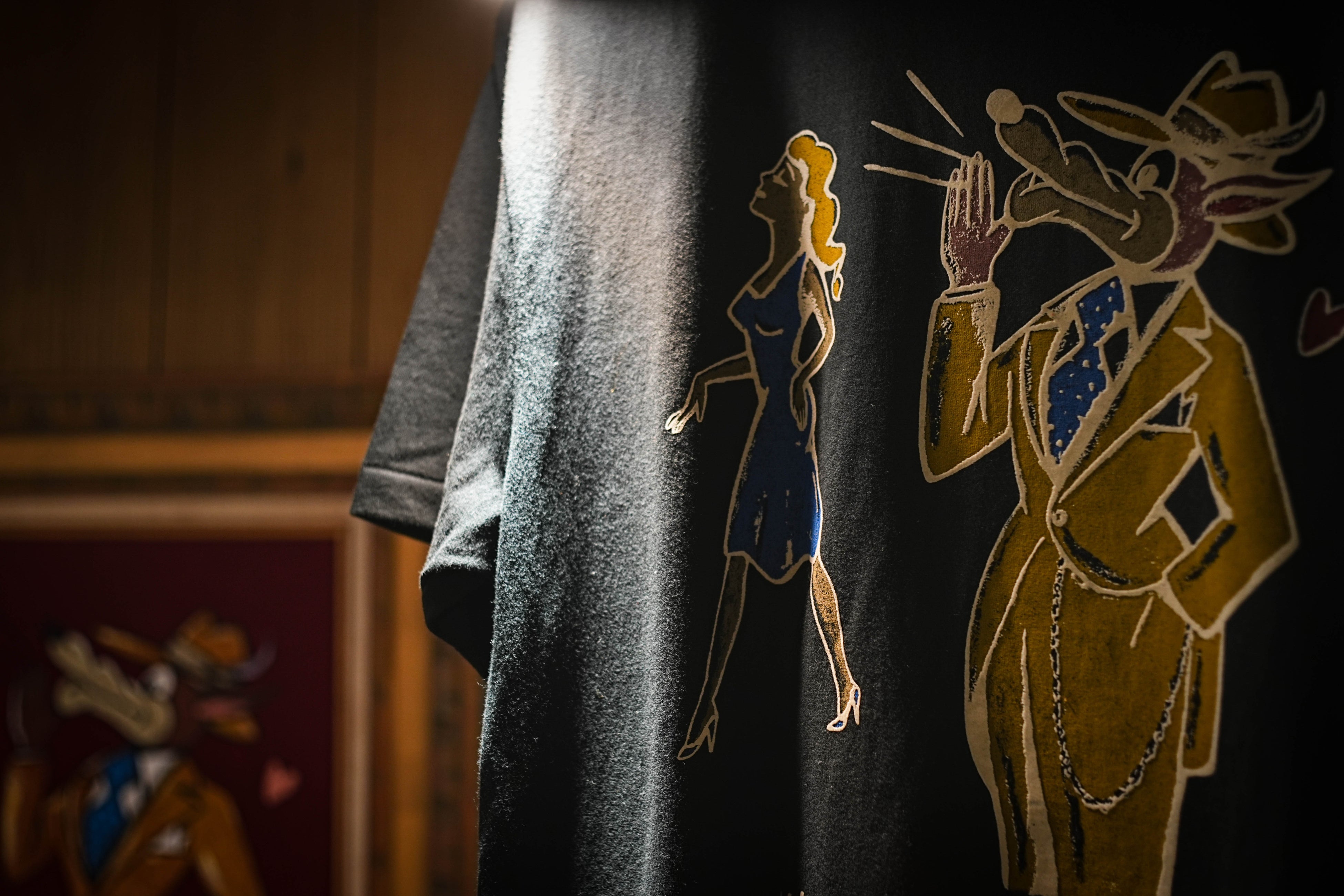 Tシャツには、そのアートワークに描かれたズートスーツを着た不良なオオカミが女性に声をかけてる様をポップに落としこみました。