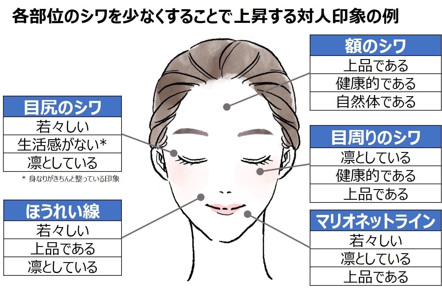 シワは顔の様々な部位に現れ、その人の個性や印象にも関わる重要な要素です。しかし、これまでどの位置のシワがどんな対人印象を与えるかということは十分な科学的検証がなされてきませんでした。