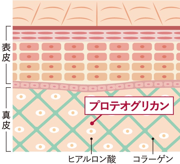 「美肌スイッチ」とも呼ばれるプロテオグリカンは、肌に元々存在しており、美しい肌のために重要な役割を果たす注目の成分です。コラーゲンやヒアルロン酸と一緒に細胞と細胞を埋めるような形で存在しており、高い保水性と柔軟性を持ったクッションのような役割を果たし、美肌のカギになる成分です。