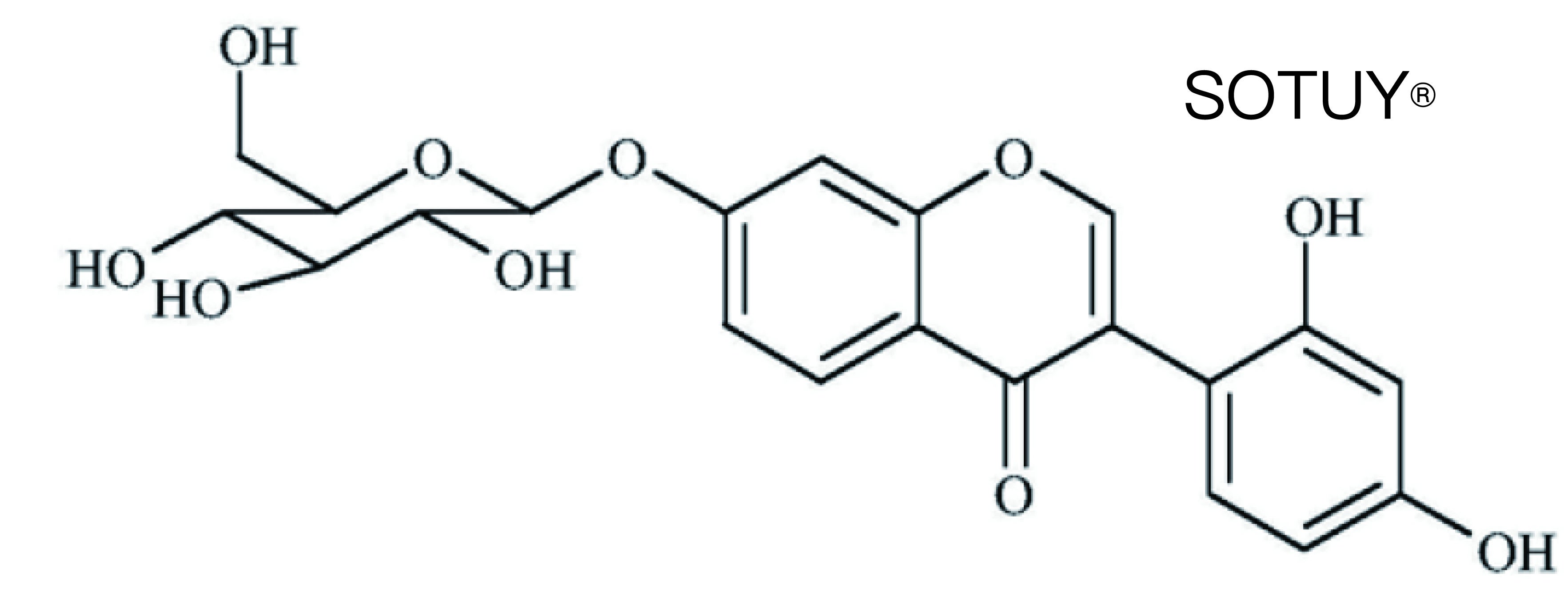 SOTUY(分子式:C21H20O10)は、その構造にヒドロキシ基やカルボニル基を含んでおり、毛髪内部の化学結合をターゲットとして、髪のダメージ部位に存在するフリーラジカルと結合し、SOTUYは損傷した化学結合を修復し、ケラチンタンパク質のアミノ酸鎖構造を安定化させる効果があると考えられます。