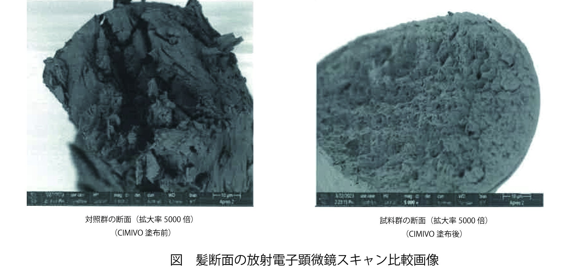 CIMIVO を5%の濃度で塗布し、3分後に水で洗い流します。24時間後、髪の断面(芯)を観察すると、図のように、内部は整然とし、さらにキューティクルは安定し厚みが増していることがわかります。ダメージを受けた毛髪を補修する効果が明らかなことがわかります。