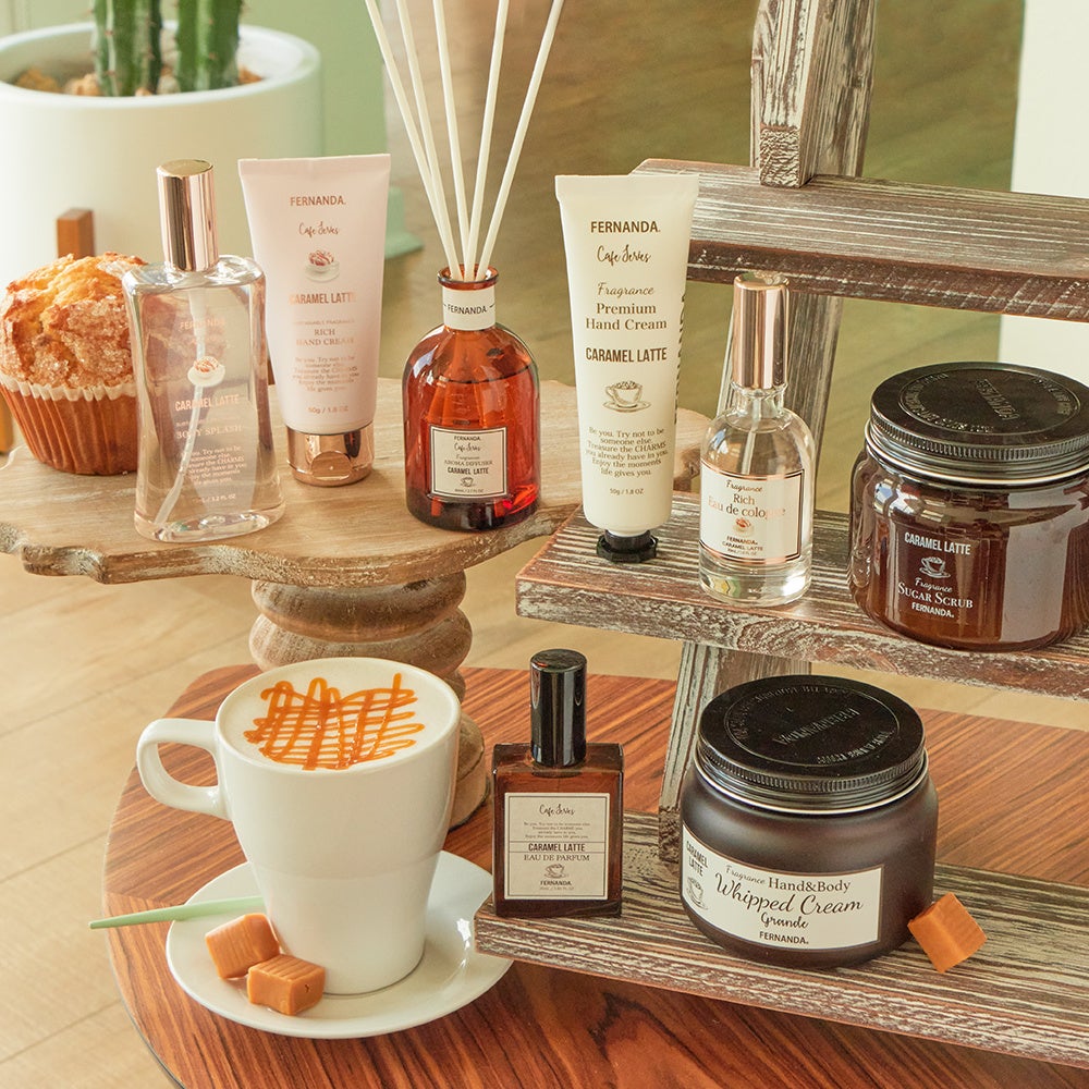 『抹茶ラテコレクション』と『キャラメルラテコレクション』のアイテムは、毎日身につけたいオードパルファムやプレミアムハンドクリームに加え、お風呂タイムが楽しみになるボディスクラブ、お部屋でいつでも香りを楽しめるアロマディフューザーなどがラインナップ。
