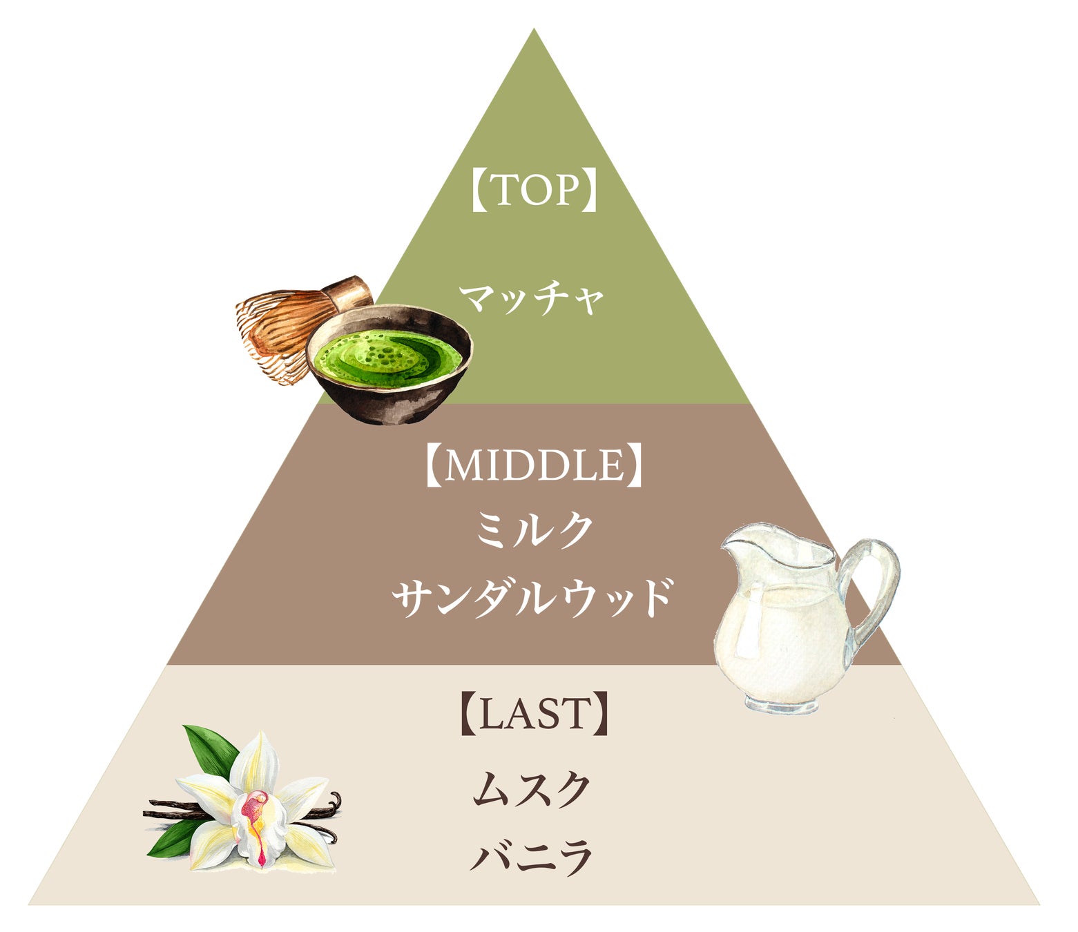 香ばしくほろ苦いマッチャ、まろやかなミルク、爽やかなムスクが重なり合う丁寧に淹れられた、深みのある大人な”抹茶ラテ”の香り。