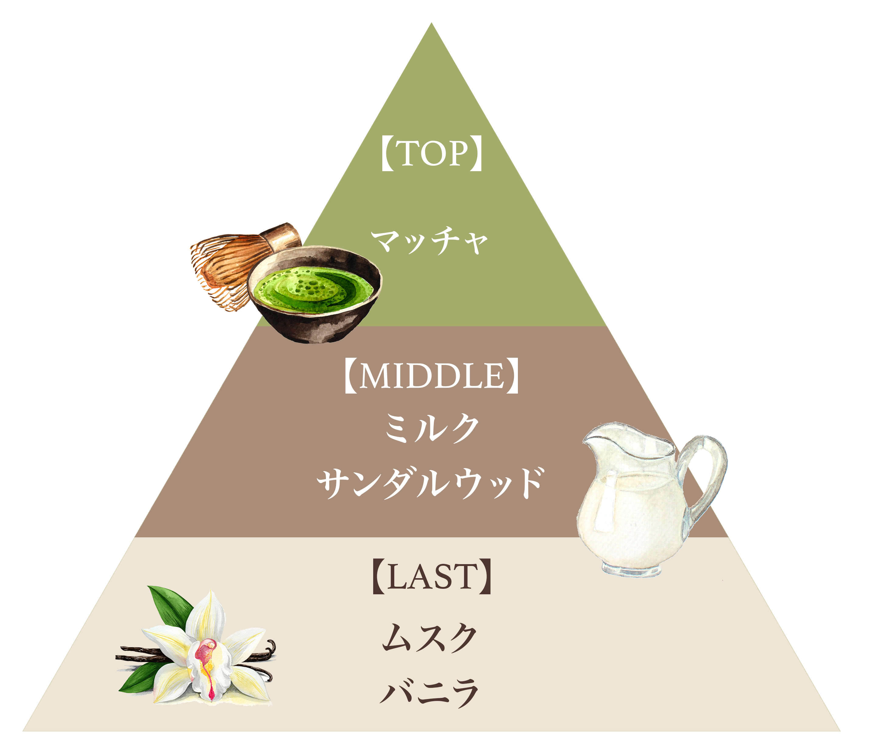 香ばしくほろ苦いマッチャ、まろやかなミルク、爽やかなムスクが重なり合う丁寧に淹れられた、深みのある大人な”抹茶ラテ”の香り。