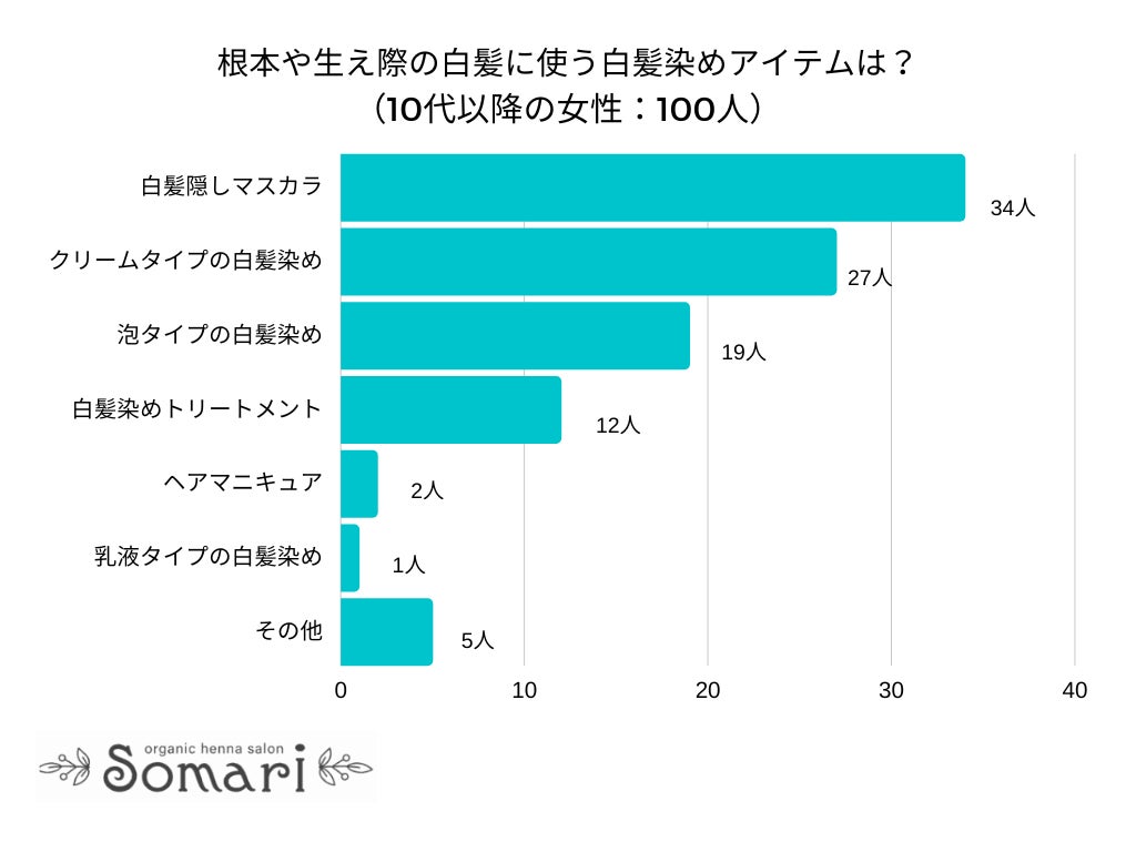 株式会社AWA(https://a-w-a.co.jp/)が運営する地域密着型白髪染め専門美容室ソマリ(https://a-w-a.co.jp/hennasalonsomari/)は、日本全国の10代以上の女性を対象に「根本や生え際の白髪に使う白髪染めアイテムは?」とアンケート調査を実施しました。