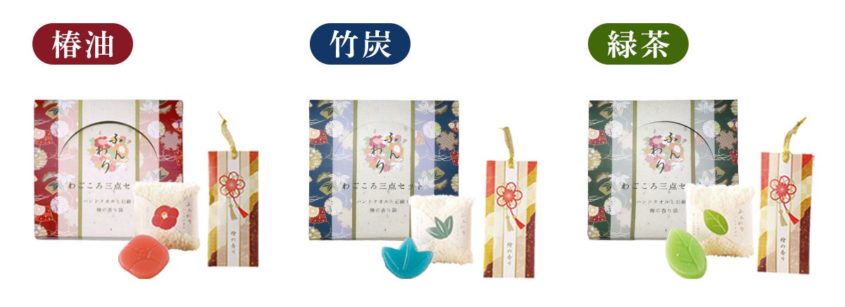2)『ふんわりわごころ三点セット』(石鹸・ハンカチタオル・香り袋)