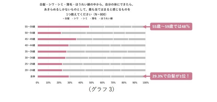 自分の体にできたら、最もあきらめるしかないと思うエイジングサインを尋ねると、白髪が29.3%でトップとなり、次いでシミ(20.3%)、ほうれい線(19.5%)、シワ(18.3%)とその他の選択肢に差をつける形となりました。また、55~59歳に限ると、白髪をあきらめるしかないと回答した人が48.0%にも上り、年齢を重ねるほど、よりあきらめてしまう傾向にあることも判明しました(グラフ3)。
