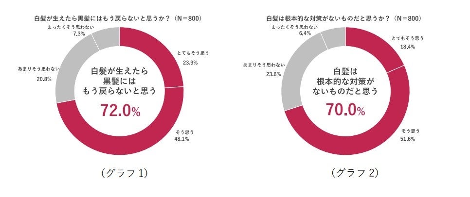 「白髪が生えたら黒髪にはもう戻らない」(72.0%)、「白髪は根本的な対策がないもの」(70.0%)と過半数以上の人が白髪への対処に苦慮。