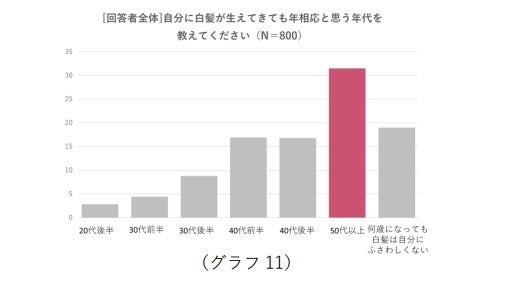 白髪が生えても年相応と思う年代について「50代以上」という回答が31.5%と最も多く、次いで「何歳になっても白髪は自分にふさわしくない」や「40代」の回答がそれぞれ20%弱という結果になりました。(グラフ11)