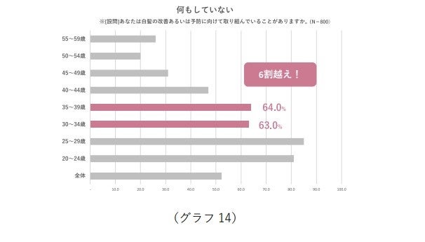 全体平均でも52.1%が「白髪の改善あるいは予防に向けて取り組んでいることはない」としつつも、特に白髪が生え、増え始める30代では6割以上が対処できていない結果に(グラフ14)。