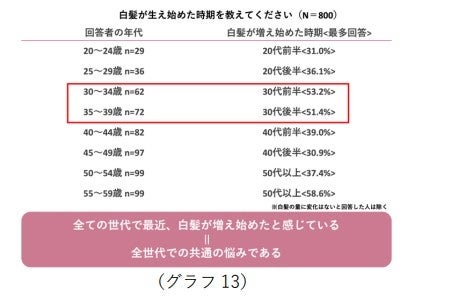 さらに今回の調査では、それぞれの世代で「白髪が増え始めた時期」について、自身の現在の年代を挙げており、30代だけでなく全ての世代が「直近で、白髪が増え始めた」と感じていることが推察できます。(グラフ13)