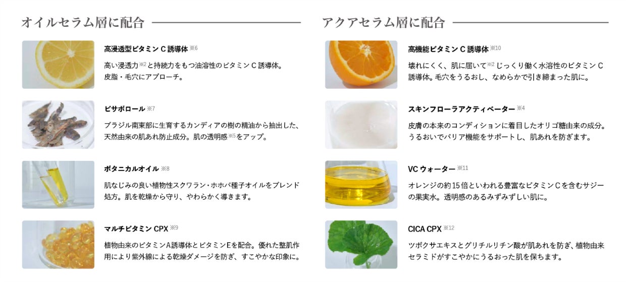 2つのセラム層には、それぞれ水とオイルになじみやすい美容成分・有用成分を厳選して配合。バリア機能が弱まり(※1)、毛穴(※1)・くすみ・肌あれが気になる大人のダメージ肌にすばやく届くよう、異なる2つの高機能ビタミンC誘導体(※3)をそれぞれの層に処方した他、肌環境のバランスに注目したスキンフローラアクティベーター(※4)をアクアセラム層に、透明感(※5)にアプローチすることで近年世界的に注目を集めているビサボロールをオイルセラム層に処方しました。