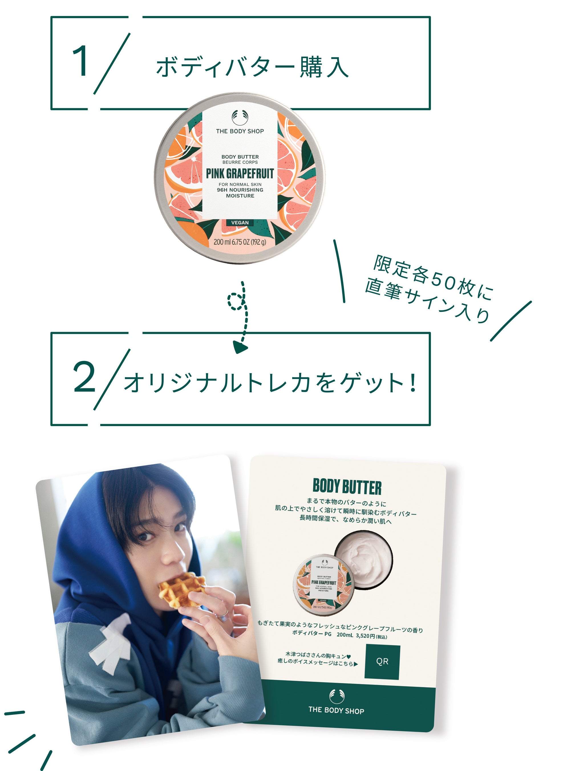 ボディバター200mLを1個お買い上げごとに、ボイスメッセージが聞けるQRコード付き撮りおろしオリジナルトレカを1枚差し上げます。