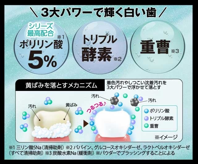 『ホワイトニングゲル』は、歯の黄ばみ(着色汚れ)を浮かして落とす3大パワー(①ポリリン酸 シリーズ最高5%②トリプル酵素③重曹)を配合した美白ケアのハミガキ粉です。やわらかいゲル状なのでお口のすみずみまで広がります。2023年3月より展開スタートし、現在SNSで話題沸騰中の人気商品です。