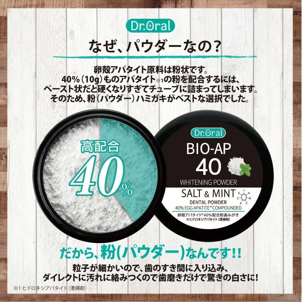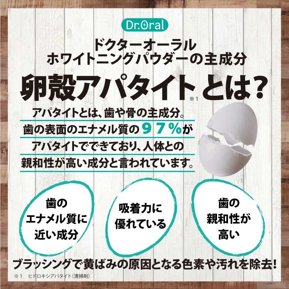 『ドクターオーラル ホワイトニングパウダー』は、歯に負担をかけることなく汚れ落ちを実感できる、業界初『卵殻アパタイト』を、40%も高配合した美白ケアの「粉」ハミガキです。普段の歯みがきケアでは味わえない、スッキリ感とツルツル感が味わえ、歯を本来の白さに導くビューティオーラルケアアイテムとして人気です。