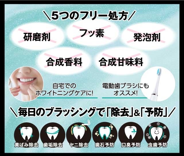 研磨剤、フッ素、発泡剤、合成香料、合成甘味料 不使用のハミガキ粉で、電動歯ブラシでもしっかり磨けます。