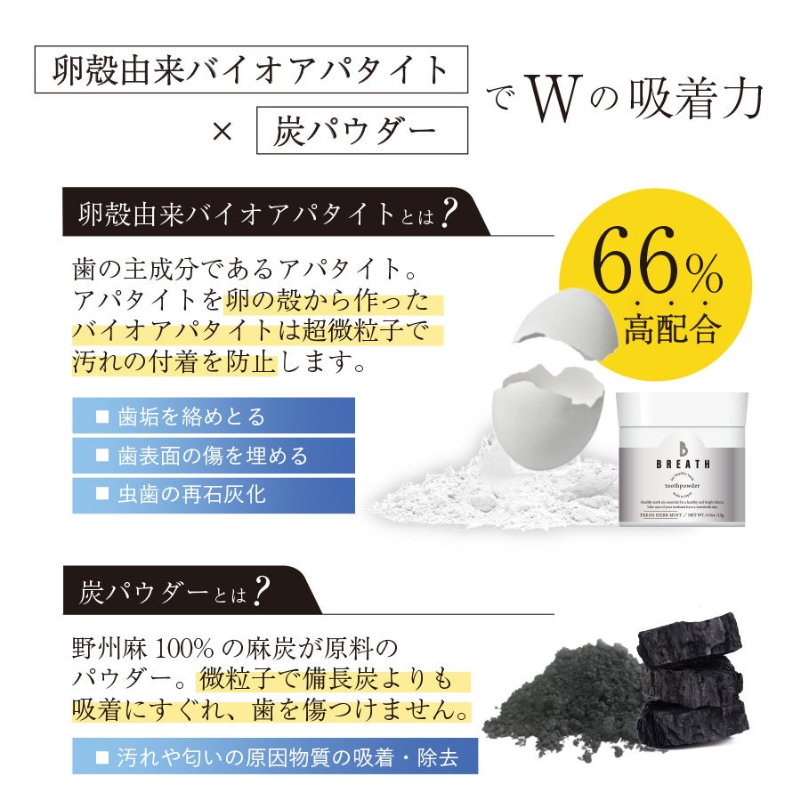 66%卵殻由来バイオアパタイト高配合したパウダータイプの歯磨き粉です。