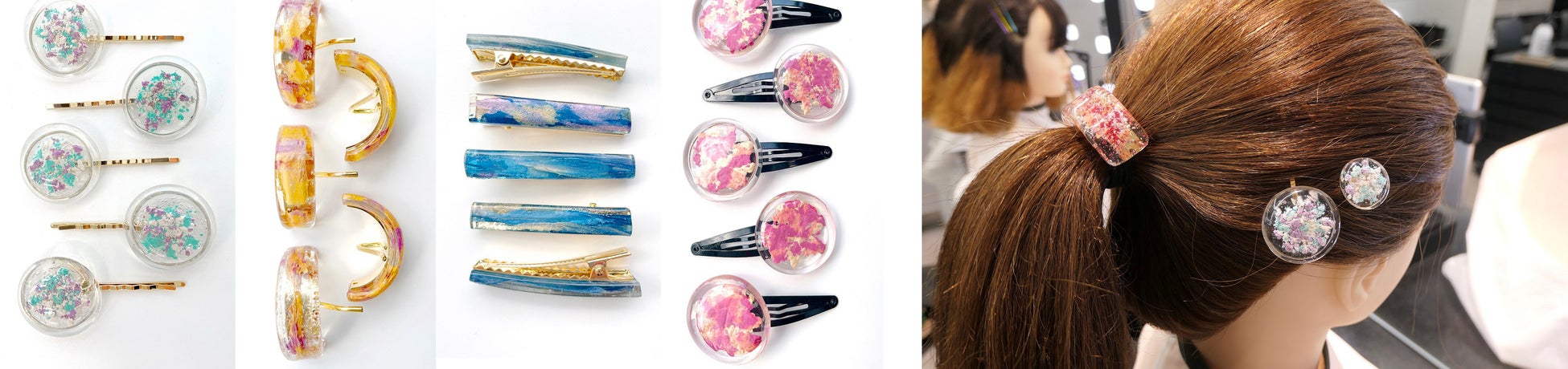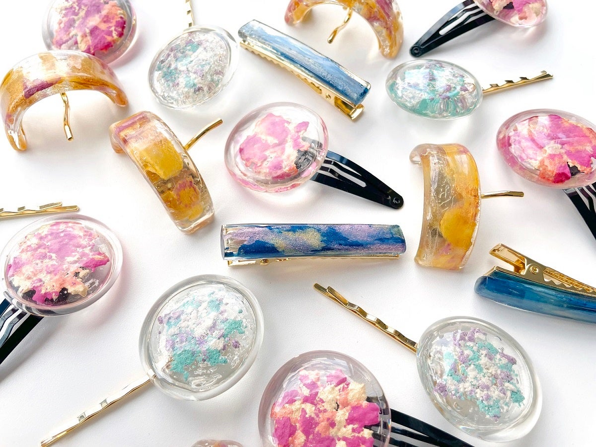 今回は、リサイクルプラスチックで化粧品バルクを包んだ唯一無二のハンドメイドヘアアクセサリーを制作しました。モーンガータを通じて供給する化粧品バルクならではの色彩をいかに自然な状態で高温のリサイクル樹脂に包み込み表現するか、またそれを透明な状態のままどう固めるかの2つが課題でした。本多プラスの未来開発室で試作を繰り返し、樹脂の適正な温度管理や成形条件を見出し、一つひとつ異なる形、色合い、デザインのヘアアクセサリーが完成しました。