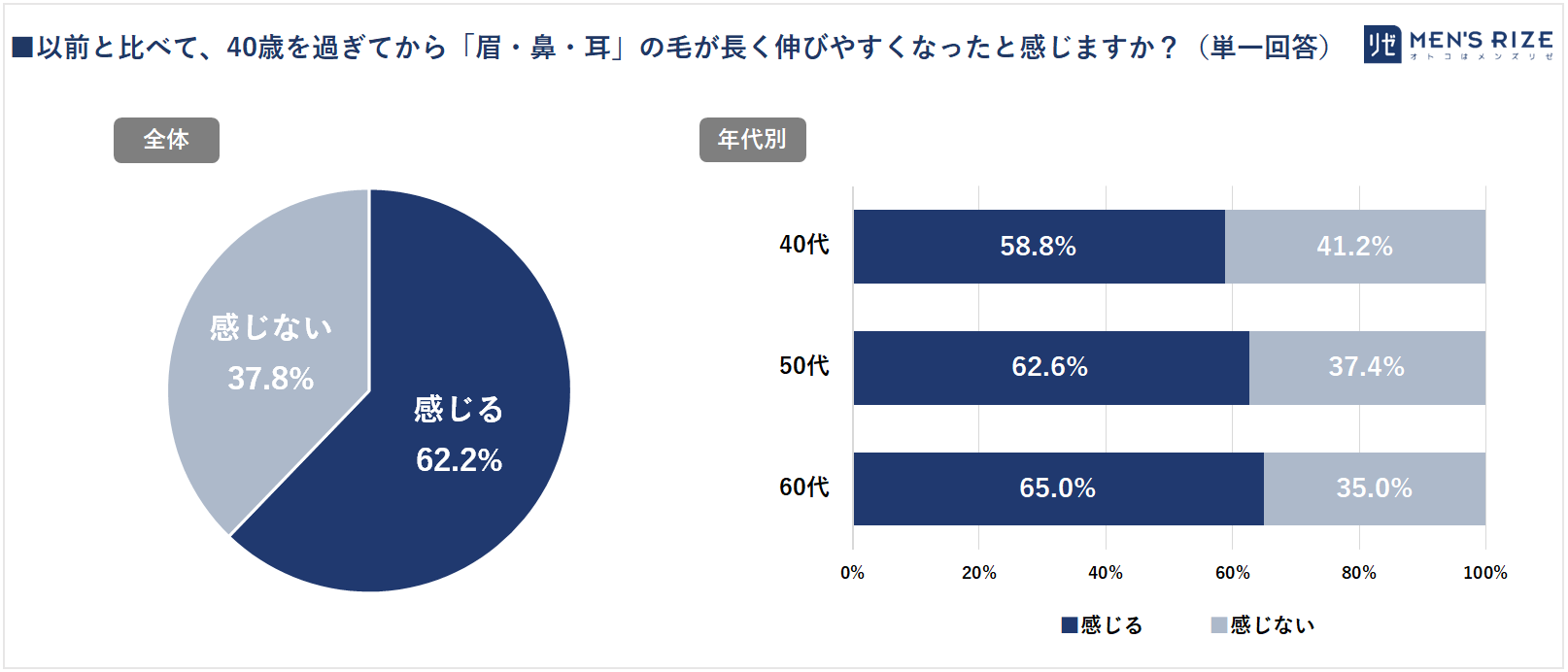 調査の結果、6割以上の中高年男性が「40歳を過ぎてから眉・鼻・耳の毛が長く伸びやすくなった」と回答(62.2%)。60代になると7割が「毛が伸びることを実感している」ことが分かりました。