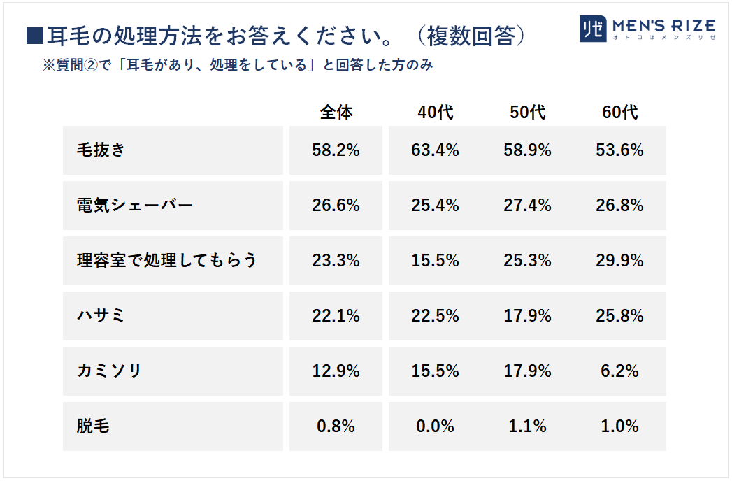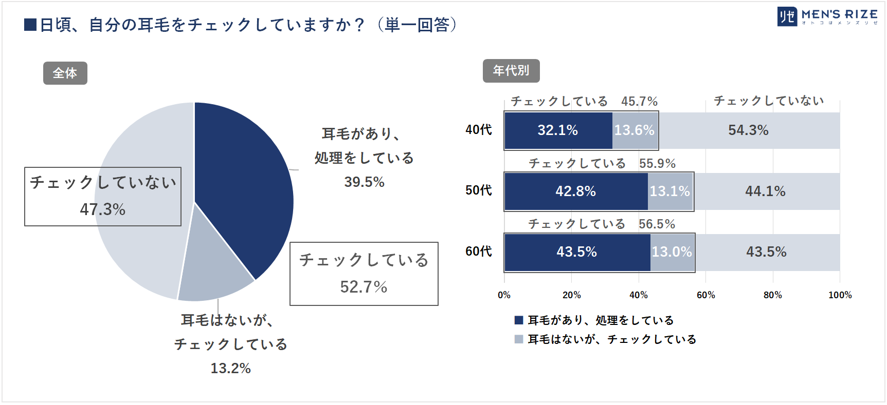 また【耳毛が生えているから、日ごろから処理している】男性は、年代が上がるにつれ増加。「耳毛処理」をする男性は、40代だと全体の3割(32.1%)だったのが、50代をこえると4割以上が処理をしていることが判明しました(50代42.8%・60代43.5%)。
