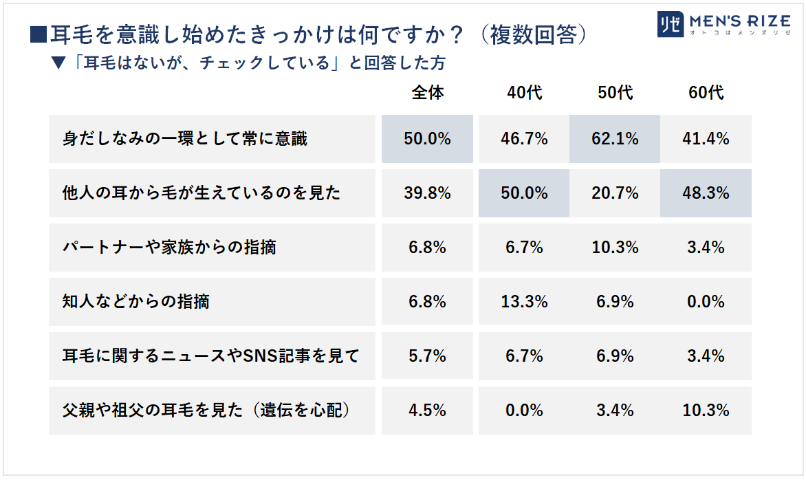 ◎60代では半数が「他人の耳から毛が生えているのを見て(48.3%)」チェックしだしたことが判明