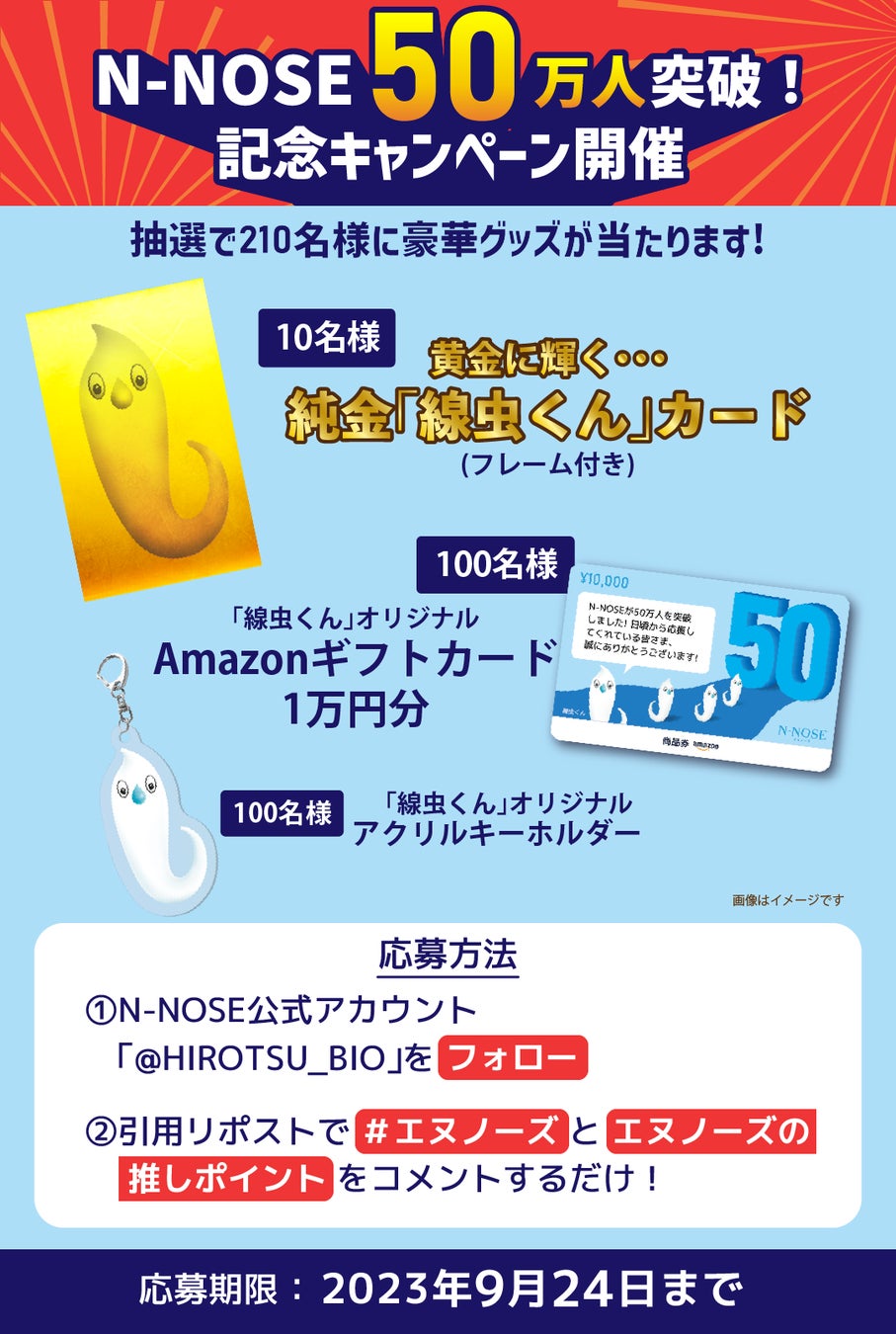 公式アカウントをフォローし、「N-NOSEの推しポイント」を投稿した方を対象に、「純金1g『線虫くん』カード(田中貴金属ジュエリー製)」や「線虫くんデザインの Amazonギフト券(1万円分)」などを抽選で210名さまにプレゼントいたします。