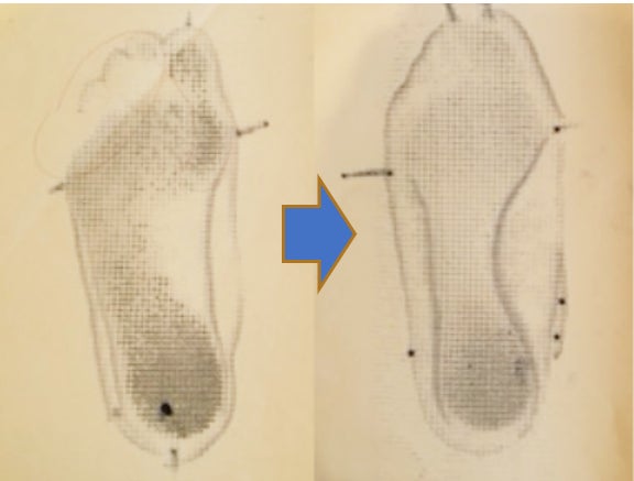 こちらのフットプリントのお客さまは、「少し歩くだけで足が疲れるから、歩くことが大嫌いだった」という典型的な扁平足のお足でした。その後、くつトレ®を実践し、わずか3ヶ月で劇的なビフォーアフターを遂げ、「今では歩くことが楽しい!」とウォーキングが日課となっています。
