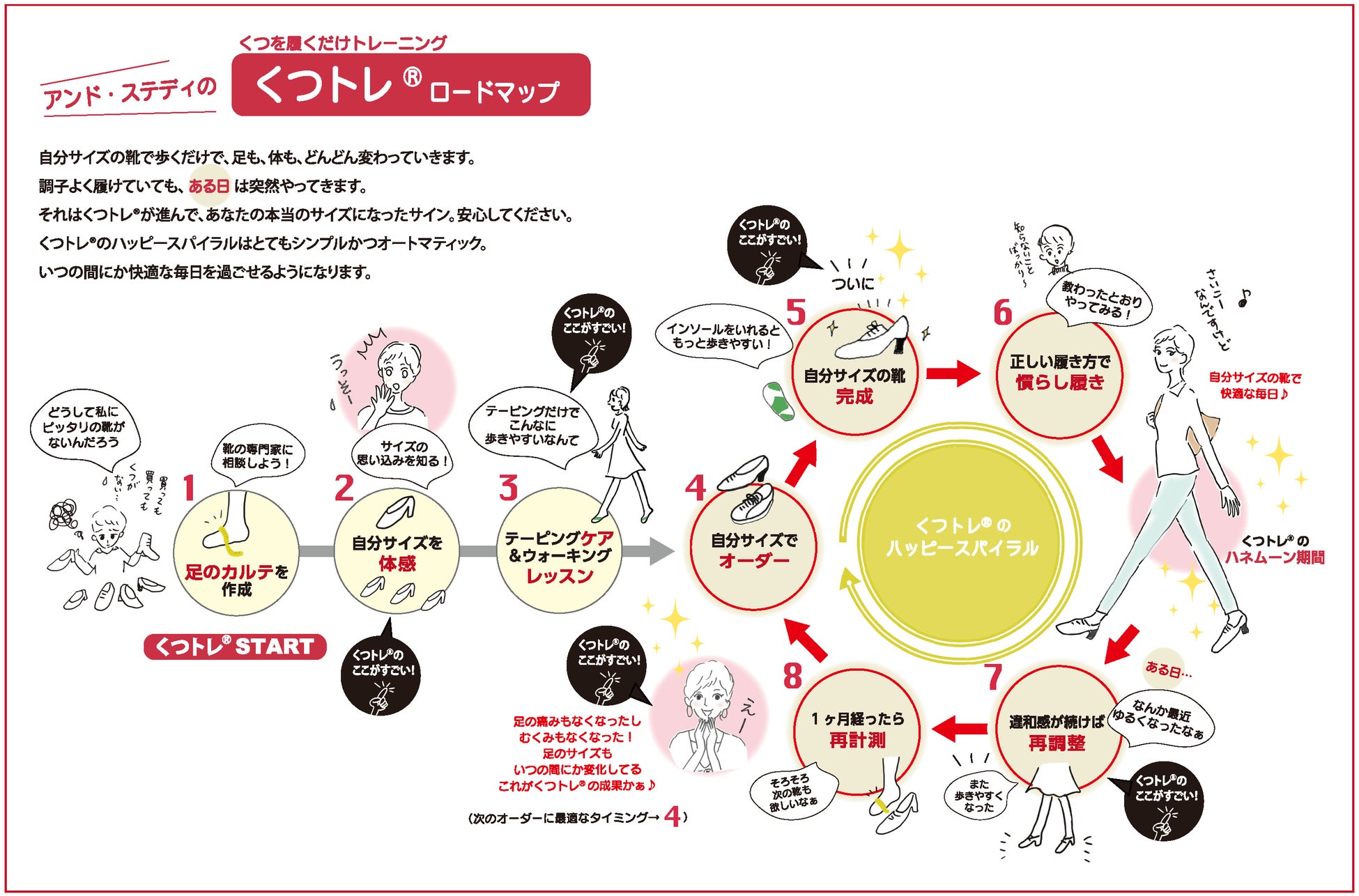一方、「アンド・ステディ」サロンでは、全国から集う靴ジプシー6,800名以上からのお悩み解決を請け負い、足に合う靴づくりに必要なあらゆる機能を加えたサービスをまとめあげ、実用的な「くつトレ®」として、靴からはじめる体づくりを伴走しています。