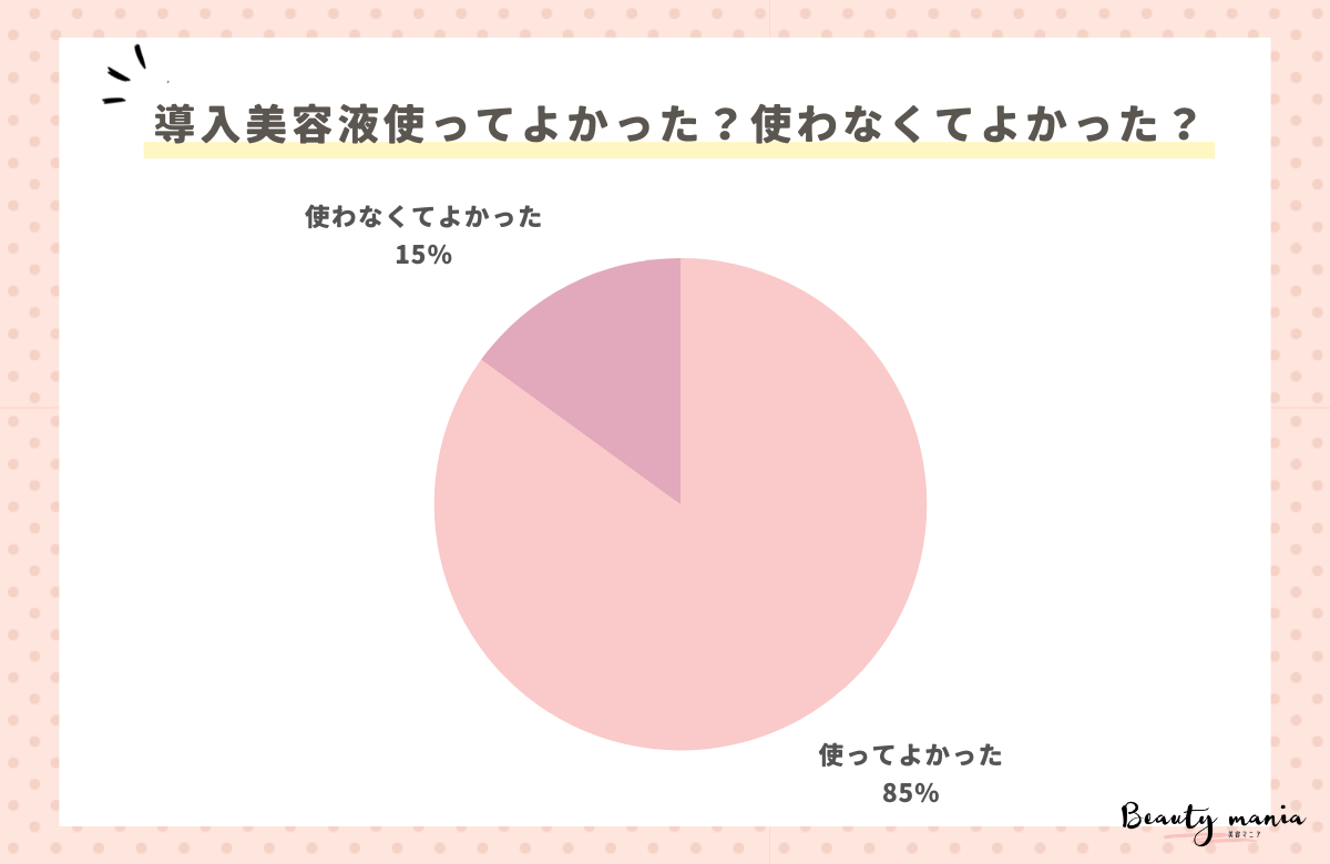 「導入美容液は使ってよかった?使わなくていい?」とアンケート調査した結果、1位は『使ってよかった(85人)』、2位は『使わなくてよかった(15人)』となっています。